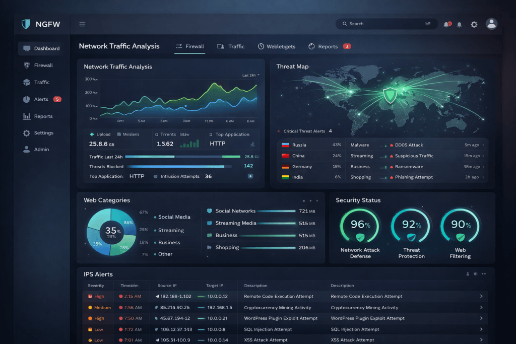 Les pare-feux de nouvelle génération (NGFW) vont au-delà du simple filtrage de ports. Ils ont la capacité de faire une inspection détaillée des paquets (DPI), la prévention d’intrusion (IPS), du filtrage web, des contrôles applicatifs et parfois antivirus et VPN dans un même boîtier.